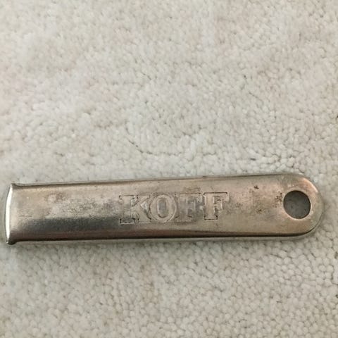 Puhelimen luuria mallintava korkinavaaja. Ehjä mutta kulumisen jälkiä näkyy. Pituus 13,5 cm, leveys 3,5 cm.
