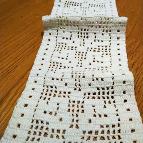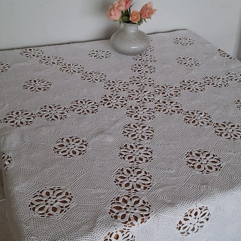 Käsin virkattu pöytäliina luonnonvalkoinen