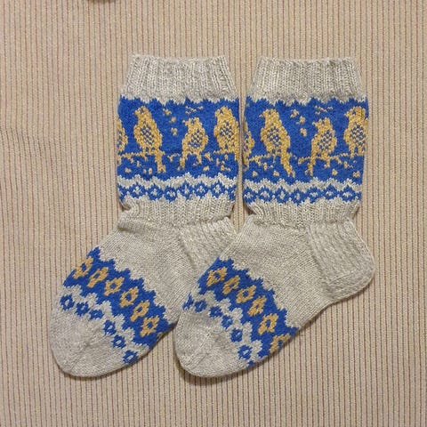Seitsemästä veljeksestä neulotut sukat joissa kanta-kärkipituus 26 cm ja varren pituus kantapään alle 22 cm, nouto tai postit.