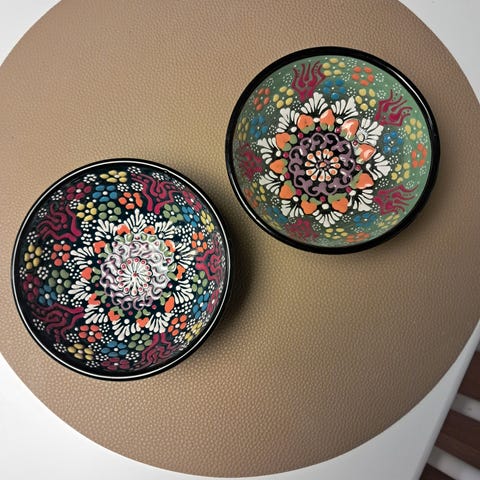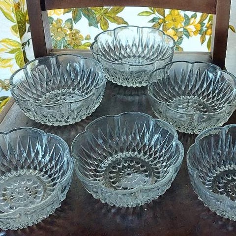 Upeat ja hyväkuntoiset vanhat jälkiruokakulhot, 5 kpl (3 vihreää ja 2 sinistä), ohutta lasia. Läpimitta 11,5 cm.