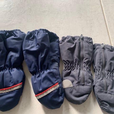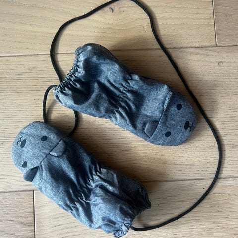 Tumman siniset peukalottomat vauvan rukkaset, jotka on kiinni toisissaan narulla. Karvasisus.