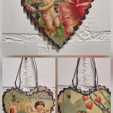 Metallisat tehty sydän, jossa enkelin kuva