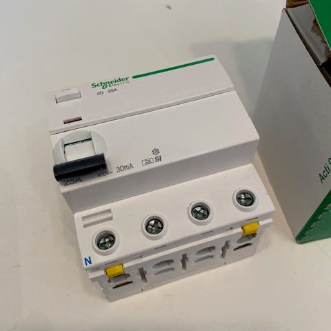 Toimivana käytöstä poistettu kannellinen IP44 vikavirtasuoja (samassa peitelevyssä ollut koje uusittiin ja vaihtui toiseen sarjaan, jolloin tämä jäi tarpeettomaksi).