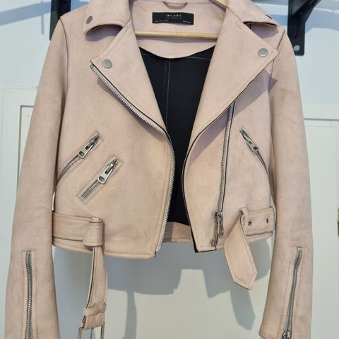 Zip- merkkinen harmaa biker-tyylinen takki. Vuori ja mustat keinonahkasomisteet.