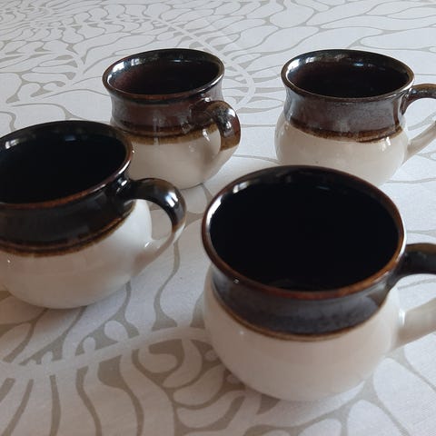 Kermansaven Heinä-aamiaissetti. Vähän käytetty ja erinomaisessa kunnossa, ainoastaan yhden kupin reunassa pieni halkeama.