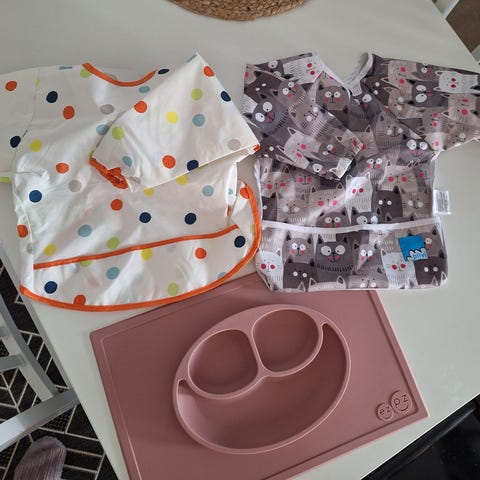 Vain pari kertaa käytetyt, kun sormiruokailukausi ehti mennä ohitse. Saa pestä tiskikoneessa. Kun pohjaa kostuttaa, alusta tarraa kiinni pöytään, ettei pikkunen niin helposti saa viskattua alustaa lattialle. Yksittäin 10€, yhdessä 15€. Mobilepay, käteinen, nouto tai lähetys.