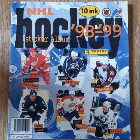 NHL jääkiekkoilijat. Tarra-albumissa kaikki muut kuvat paitsi numero 37 Stephane Richer. Kaikki sivut tallella, muutama sisin sivu irti niiteistä. Tee tarjous. Voin postittaa.