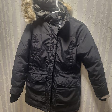 Everest in lämmin toppatakki, parka malli. Täyte vanua. Kiristysnauha myös vyötäröllä, mutta kuvassa ei ole kiristetty. Helman nauhat myös säädettävät. Irrotettava hupun karva. Koko 34, mutta vastaa 36. Vähän pidetty, joten kunnossa ei moitteita.