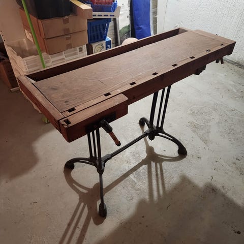 Nyt tarjolla erikoinen, vanha munanhaudontapöytä. Meille ruokapöydäksi liian korkea. Jos lyhentäisi jalkoja, omat jalat ei mahtuisi pöydän alle.