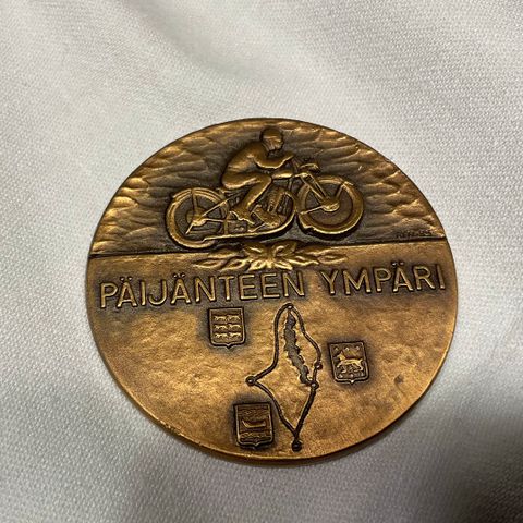 halkaisija 5,4cm, paino 125g, patinoitumaa, toisella puolella teksti: Vierivä kivi ei sammaloidu.