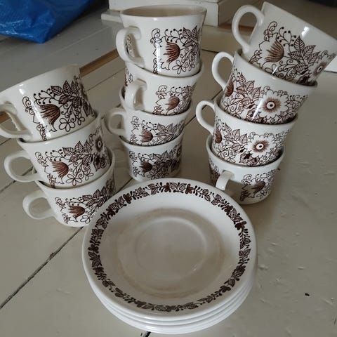 Hyväkuntoisia. Sisältää 3 kahvikuppia, 4 kahvikupin tassia ja 5 pullalautasta. mmm.