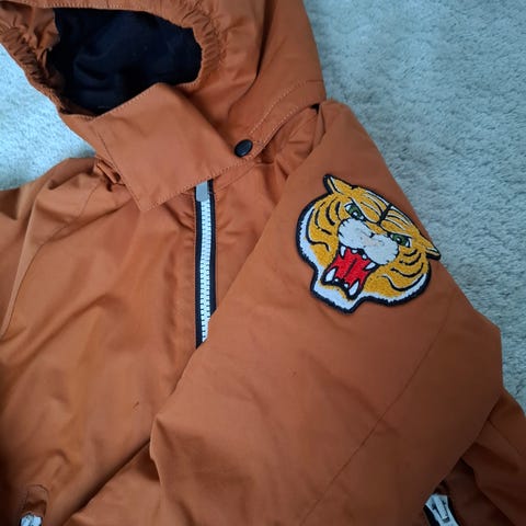 Kuvan mukainen sininen Reiman toppatakki kokoa 128. Hupun voi irrottaa. Vetoketjullinen hihatasku. Etutaskut napilliset.