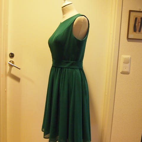 Uusi Orsayn violetin värinen juhlamekko vaikka pikkujouluihin, yksiolkaiminen, pituus vähän polven yläpuolelle, edessä laskosröyhelö