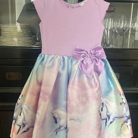 Kaunis, haalean vaaleanpunainen juhlamekko koossa 122. Takana vetoketju. Malli takaa hieman pidempi.