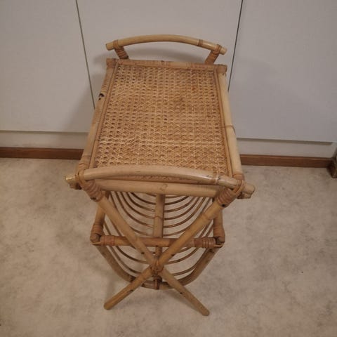 Ruskeaksi sudittu rottinkitaso-pöytä-lehtiteline Koko: syvyys 51cm pituus 61cm ja korkeus 50,5cm. Taso saanut vähän kosteutta eli noussut parista kohtaa vähän. Yleisilme siisti. Nouto Raisio, MMM.