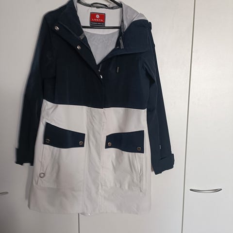Valkoinen Columbuksen ulkoilutakki, koko pieni L, vartalon myötäinen malli, veden kestävä. Paljon yksityiskohtia. Muutama jälki, yritin ottaa kuvat niistä. Kai-kai 55cm ja niska-helma 80cm.