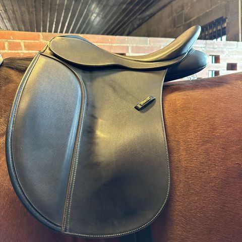 Wintec Isabell Werth synteettinen koulusatula Cair-ilmapaneeleilla. Itse olen ostanut 16,5", mutta merkinnät kuluneet pois, joten ei varmaa tietoa. Viestillä saa lisää mittoja -ja kuvia.