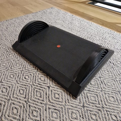 Jalkatuki esimerkiksi toimistotyöhön. Jalkatuen taso pyörii akselinsa ympäri ja siinä on 4 eri korkeutta kiinnitykseen.