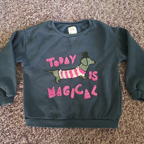 Pitkähihainen pusero pehmeää. Edessä kääntöpaljettikuva. Ribbiresori pääntiessä, hihansuissa ja helmassa.