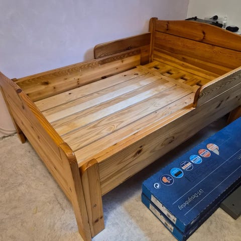 Jatkettava lastensänky, valmistettu puusta. Sängyssä on päädyissä korkeat laidat ja puinen sälepohja. Pituutta voi säätää lapsen kasvaessa. Sopii käytettäväksi lastenhuoneessa yksittäisenä sänkynä. Patja on kolmessa osassa ja päälliset vetoketjuilla, eli irrotettavissa. Muuten kunnoltaan hyvä, mutta laidoissa on jonkin verran lakkauksen kulumia. Tarjoa ja kysy viestillä lisää!