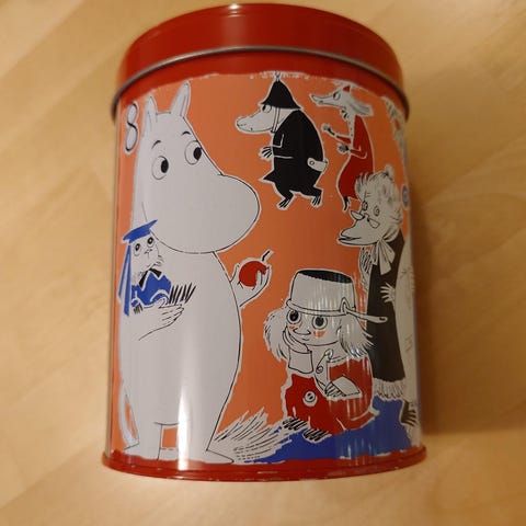 Fazerin Tove-100juhlavuoden peltinen Muumi-keksipurkki.Purkki on