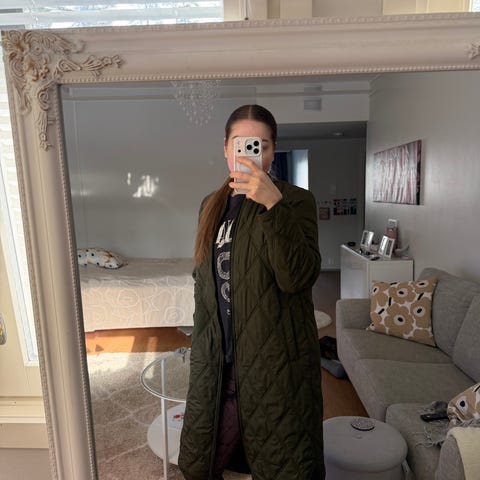 Topattu takki pituus edestä 103 takaa hiukan pitempi rinnan ympärys n.108