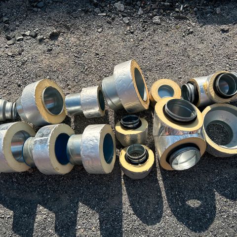 Ilmastointiosia: kannakkeet jalkaruuvin kanssa, jatkoliittimiä, seinätuloilmaventtiilejä, t-haaroja, kierrekanavaa, venttiilikauluksia