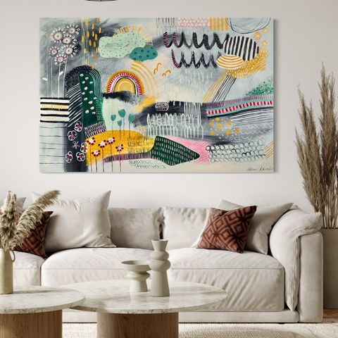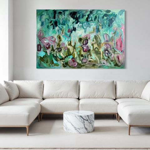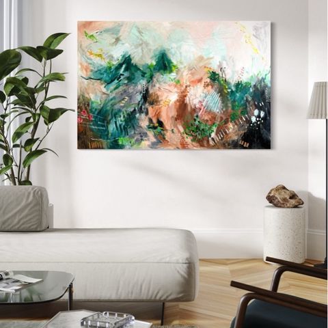 Iso työ, 120x100 cm, ja se on täyttä iloa. Värit on kirkkaat ja rohkeat. Tämä on just sellainen taulu, joka tuo huoneeseen hyvän fiiliksen ja muistuttaa niistä hetkistä, kun kaikki tuntuu just oikealta.