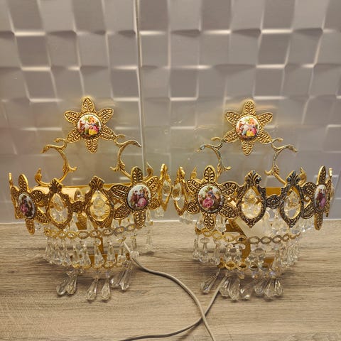 Sähköistetyt kristalliset seinälampetit. Kullattua messinkiä. Hinta-arvio näille 150-300e/ kpl. Nämä ovat hyvässä kunnossa ja myydään ainoastaan yhdessä. myynnissä myös muualla ja ainoastaan nouto Vihdistä.