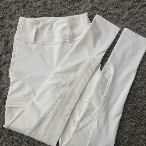 Valkoiset Eurostarin ratsastushousut. Koko 42, vyötärö n. 80-81 cm, joustaa vähän, lantio 90, joustaa hyvin. Lahkeen sisämitta 65 cm, sivusauma 90 cm. Kuvassa surkean näköiset, livenä kivan näköinen pinta.