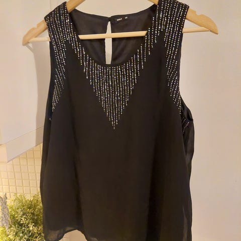 Musta sifonkitoppi, jossa joustava vuori, sekä strassi-ja helmikoristeltu pääntie. Koko 38. Only merkkiä.