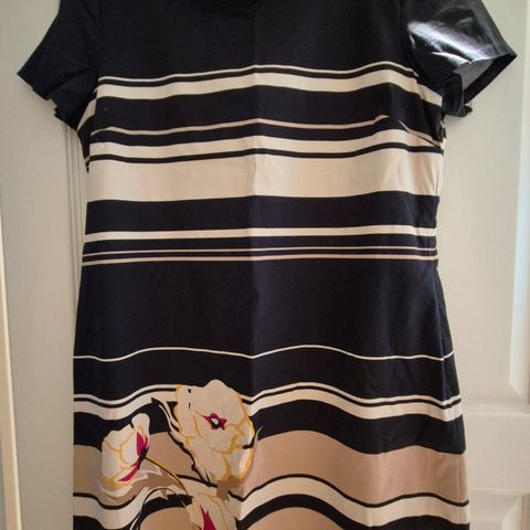 Tyylikäs musta joustava mekko, jossa paksu kuminauhamainen vyö ja vihreäkuvioinen läpikuultava löysähkö yläosa. Yläosan kangas ei jousta. Koko 42.