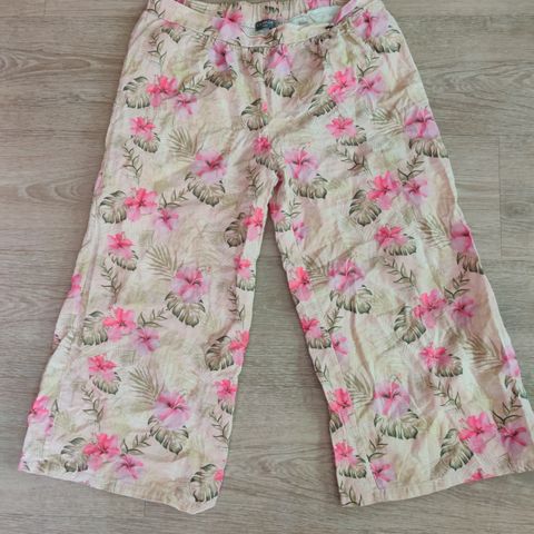 Vaaleanpunaisen tai roosan sävyiset pehmeät samettitrikoohousut, joissa leveät lahkeet. Koko 152 cm.