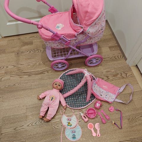 Lisäksi kaunis nukenkehto patjalla ja katosverhoilulla. Samassa paketissa kolme vauvanukkea, joista yksi alkuperäinen BabyBorn ja muutamia vaatteita niille.