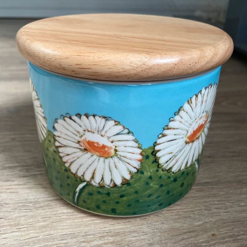 Arabian keraaminen 'Aurinkoa kohti' -purkki puisella kannella. Suunnittelija Heljä Liukko-Sundström. Valmistettu vuonna 2010. Koko 0,7l.