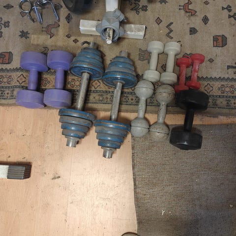 tangoineen eripainoisia levypainoja kahdellla kiinteällä käsipainolla 5 kiloa kumpikin