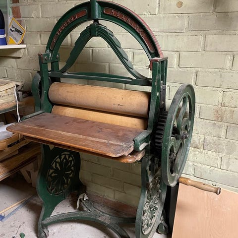 Hyväkuntoinen ja siisti mankeli. Voidaan käyttää pöytätason päällä tai asentaa erilliset jalat.