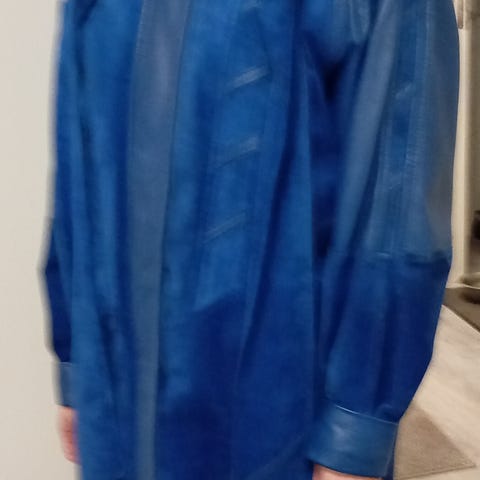 Antiloopin nahkaa, paristi käytetty, itselleni liian iso, huppu irrotettavissa, koko M, kai - kai 60 cm ja olka - helma 88, vyötäröllä kiristys nauhat, väri tumman sininen.