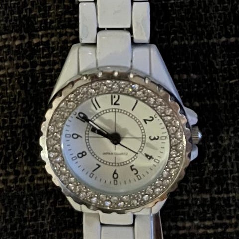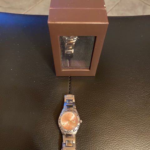 Rannekkeesta kulunut kultaus lähes kokonaan pois , lasissa naarmuja ja takakannen saumassa hapettumaa. viat näkyvät kuvissa