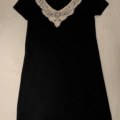 Lumoan-merkin laadukas musta pitsikauluksinen trikoomekko. Koko XS. Tyköistuva malli. 3/4-hihat. Vetoketju takana. Pitsikauluksessa pieni virhe (huomioitu hinnassa). Mekon pituus olkasaumasta helmaan 96cm.