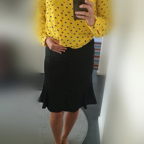 Musta, pitsinen H&M:n hame. Koko 36, mutta vastaa paremmin kokoa 34. Vetoketju vasemmalla. Hameen pituus 59cm. Vyötärön leveys 34cm.