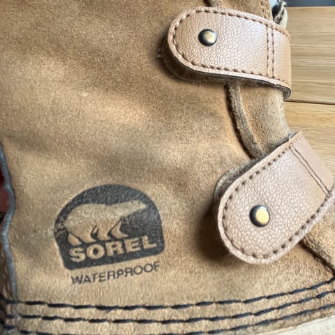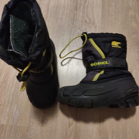Kuvan Sorelin loskarit. Käytetetyt. Kannoissa kulumaa. Ehjät. Tässä mallissa ei ole irroitettavaa huopavuorta. Pohjallinen n.18cm