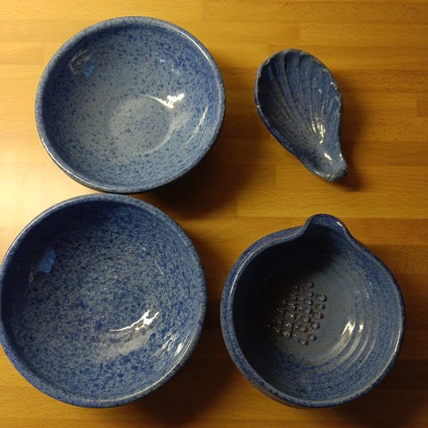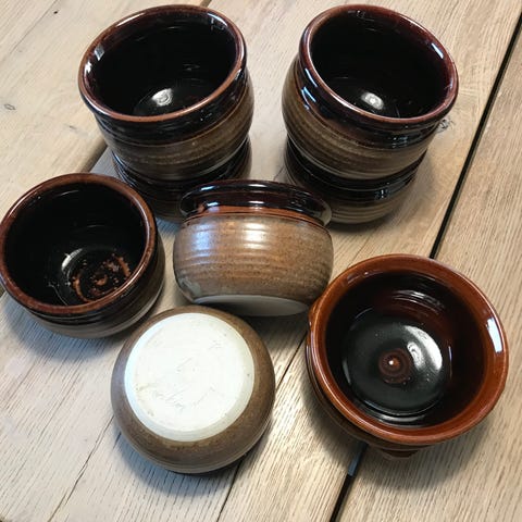 Kyyrölän Saven yksi isompi puuroastia sekä 7 kpl puurokulhoa. Yhdessä kulhossa halkeama, kts kuva.