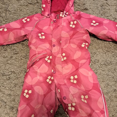 Reiman kaunis toppahaalari tytölle. Koko 86. Kaunis kuosi ja lämmin haalari. Polvet ja peppu vähän kuluneet, toinen jalkarenksu puuttuu. Siisti yleisilme ja toimii hyvin kylmillä keleillä.