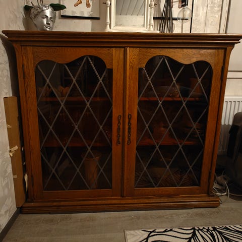 Lasiovet, lasihyllyt, pehmustettu takaseinä kaapin sisällä.