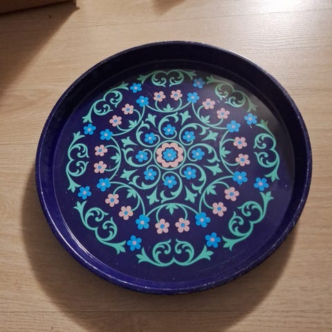 Tarjottimen koko 26 x 19 cm, kuvun alla oleva tila n. 20 x 13 cm, korkeus n. 7cm