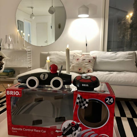 Brio kauko-ohjattavan kilpa-auto. Lelu sopii täydellisesti pienille lapsille, sillä auton ohjaaminen kauko-ohjaimen yhdellä painikkeella sujuu helposti vain muutaman harjoituskierroksen jälkeen. Tavoitteena on kehittää lasten näppäryyttä ja ohjaustaitoa hauskalla ja mieleenpainuvalla tavalla.
