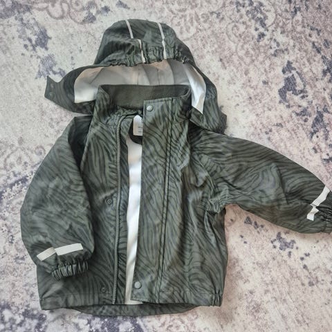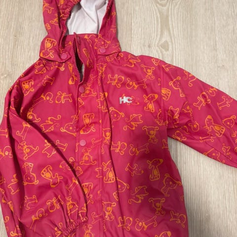 Rain wearing sadetakki. Napillinen huppu. Lapsi ei ole pitänyt kertaakaan, on kuin uusi. Vain nouto Kortepohjasta