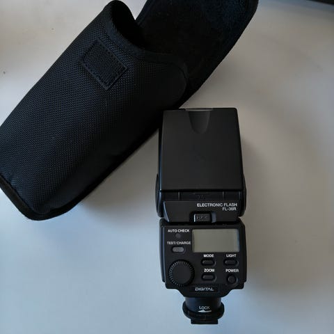 Käyttämätön Olympuksen pieni TTL-Salama FL-20. Ostin tämän joskus varalle, mutta ei ikinä tullut tarvetta. Toimii kahdella sormiparistolla.