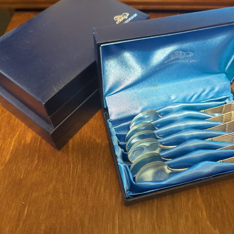 TÄHKÄ, sokerilusikka ja hillolusikka koteloissaan.